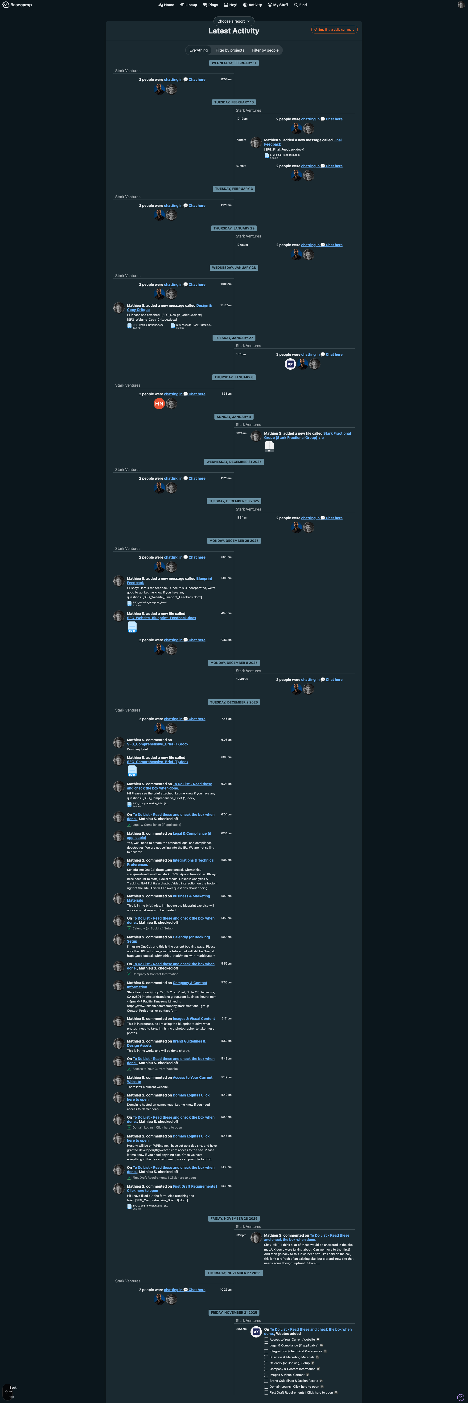 My company is "Stark Fractional Group." The Basecamp project breadcrumb reads "Stark Ventures > To-dos." Their deliverable files were named "Stark_Ventures_1_1.pdf" and "Stark_Ventures_UX_Blueprint_1_1.pdf." The correct name was on the first page of the brief I uploaded. Eventually corrected, but it tells you how carefully the brief was read.